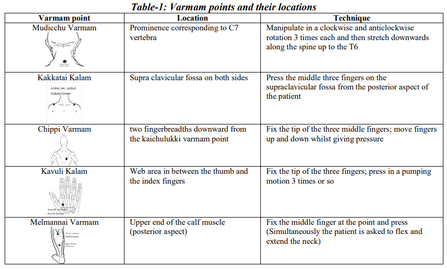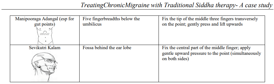 In initial week, patient could see difference in her neck stiffness. She could notice that she was able to sleep well for 8 hours while earlier she could not sleep even for 2-3 hrs without disturbance. Pain in neck reduced from 9 to 4 in just first week. She also was advised to reduce her medications in a weeks time so that her dependency on pain killers is reduced and the outcome of siddha therapy can be visualized. On 7th day of treatment, the patient underwent the sinus session done by Chief healer who performed the procedure by hand pressure therapy (Varmam) along with some hard strokes on the cervical region. She initiated by pressurizing her fingers into nasal cavity and manipulating with fingers. She used different hand pressures like Thadaval and Amartthal to stimulate "varmam" points at neck and nasal area.The Varmam points that are stimulated to achieve a therapeutic effect in the treatment of patients diagnosed with Cervical Spondylosis and migraines in Siddha therapy are mentioned in Table-1.