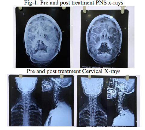 After the 15th session, the patient was asked to come only once a week for next 4 sessions and was advised to notice all developments in her symptoms. In all next 3 sessions & 1 gut session, she was monitored for feedback related to her sleep and headaches intensity. At the end of treatment, the symptoms presented by patient at time of admission like sleeplessness, stiffness in neck, headache remarkably improved. Depending upon the feedback, X-rays were taken out for pre and post appearance of PNS and cervical region (Fig-1).
