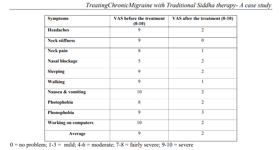 From last 1 year due to office problems, her anxiety levels were increased leading to frequent attacks of migraine with more intensity. Infact, from last few months, she was working from home due to travelling and sound which was initiating her headache episodes more. She was also avoiding her family functions and dayouts with family so her family life was getting perturbed. She was having low blood pressure and her weight was decreasing. While examination, her BP was 100/70 mmHg and weight 59 Kg. In recent past her pain scale was aggravating even by routine physical activity and wasoften accompanied by nausea or vomiting, so she wanted a treatment in Siddha which help her lead a normal life and treat her without medications.