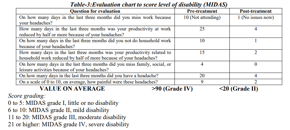 Significant changes in signs and symptoms were noticed before treatment and after treatment results. The patient showed no symptoms for vomiting in the gaps; however sometimes she had nausea due to smell of food. She felt decreased heaviness in frontal head region and no severe migraine attacks. She was able to sleep for 8-9 hrs without disturbance and was able to do walks for 40 mins. The most important development was she was not taking any NSAID’s from last 10 days and was able to attend to her office and other family functions. She was not having any constipation issues after the gut session. On last session, Visual Analog Scale (VAS) score along with Migraine‑ Induced Disability Assessment Score were determined. VAS score reduced from 9 (severe) to 2 (mild) and MIDAS score which was 72 (severe) came to 19 (moderate disability).(Table2,3) On 1st and 2nd follow up there was no attacks of migraine in between the course of duration.