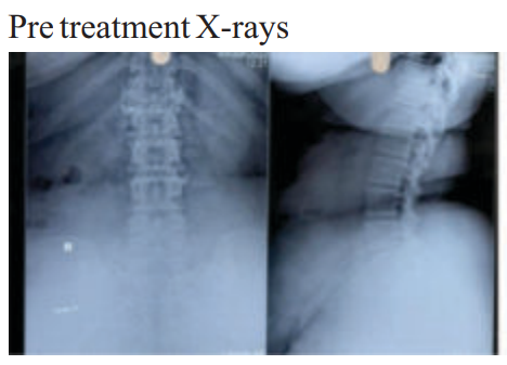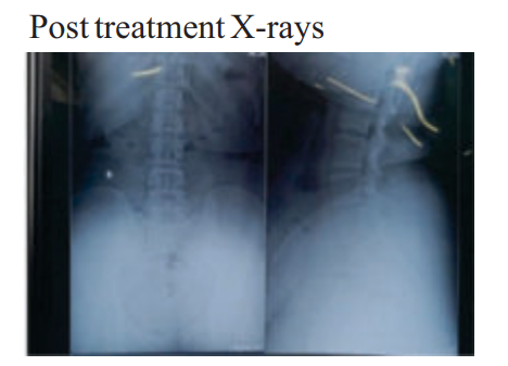 The patient showed a very good response to the treatment in 1 months time period. Overall, she felt improvement in all her complaints related to walking, standing, bending and stiffness in hip & thigh region with almost no radiating pain in legs. On the VAS scale pain had reduced from severe (9) to mild (3) (Table1) and measurement of ROM of her spine and hip joints was noted (Table 2). The stiffness in her lower back was moderately mild and was able to bend freely. The symptoms pre and pos treatment were also noted (Table 3). She was able to stand for 40 mins in kitchen and could walk for 30-40 mins in good speed with mild pain on VAS scale. She had lost total 19 kgs and was so satisfied with treatment (Table 4). The waist line was measured which reduced from 51.5” to 42” (Table 4). Clinically, pre and post x-rays also verified the success of treatment (Fig.1).