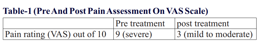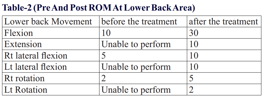 The Orthopaedic doctor advised for lower back surgery but patient was reluctant for the same. She continued with a course of steroids and was referred to Physical therapist to strengthen the core muscles. The patient showed minor pain reduction on warm application with exercises and some improvement in the daily activities. However, the pain progressed over last 2 years to the extent to which the patient had difficulty in day-to-day activities like standing for 5 mins, sitting, unable to sit cross-legged, and bending. During the last 2 years the pain has aggravated to a scale of nine (severe).