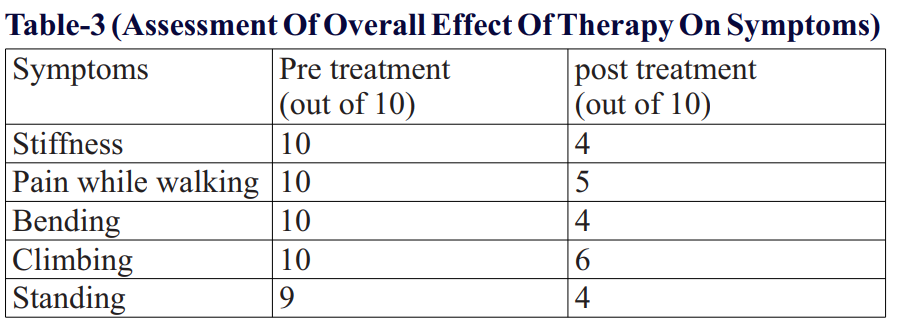 In the 2nd and 3rd week, she lost 8 kgs and was now able to walk for 1/2 km with very less discomfort in her joints while before treatment she could barely walk for 5 mins. She was able to stand in kitchen for 15 mins with little discomfort and was able to do the exercises as been told by Physiotherapist otherwise earlier due to stiffness in back she was unable to continue for even 5 mins. The pain intensity which was severe (9) on VAS scale reduced to moderate (6-7) in 2 weeks and the radiating pain in her legs also reduced. From last 3 years she was not taking stairs down but now she was able to take 2 floors down. She initially complained for cramps due to wt loss but her diet was monitored by the Nutritionist.
