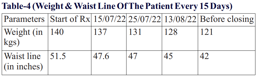 It was a diagnosed case of lumbar spondylosis represented and amelioration by continued motion and pressure. There was relief from warm application also. The treatment was started on 13th July, 2022; it was planned for 45 days with 30 days in the initial phase and the rest of 15 days after a gap of 2 months.